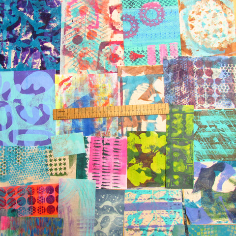 They are mostly handmade monotype prints made with a Gelli plate although some are hand painted. The paints are mainly acrylic although there may have been some printing ink and cyanotype. Some have lustres from metallic and iridescent paints. Most have layers of colour and designs vary including: abstracts, geometrics, textures and botanical.