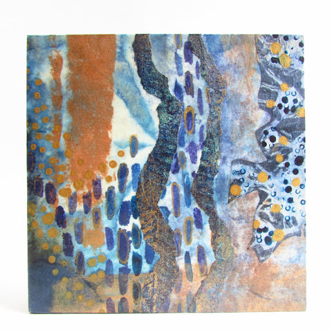This mixed media collage is created using original monoprints and hand painted elements all mounted on a wooden canvas measuring 12.7cm x 12.7cm and 2.1cm thick. It is fitted with a fixing on the back to allow you to hang it or it can be stood on a shelf.