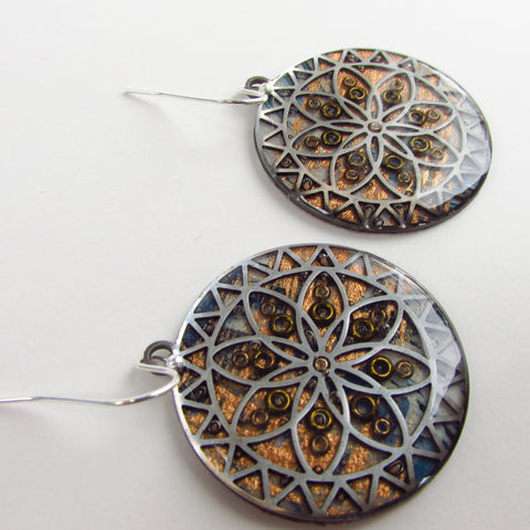 Add a touch of flair to your jewellery collection with these stunning mandala style earrings. Each pair features a unique monoprint base, creating intricate patterns in shades of copper and deep blue. No two prints are ever exactly alike, giving you a truly one-of-a-kind accessory.