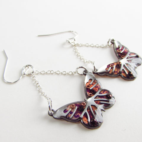 Make a bold yet elegant statement with these monoprint butterfly earrings. Each pair begins with an original monoprint base, created using layered paints that produce rich, organic copper and purple tones. Because every monoprint is made individually, each set of earrings is completely unique.